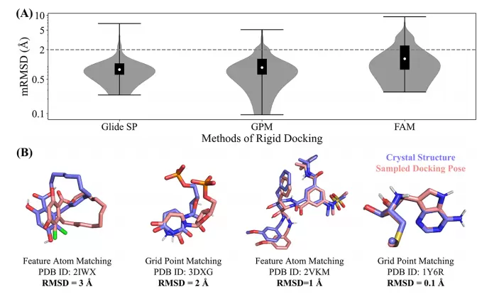 图片2:(A)网格点匹配(GPM)和原子特征匹配(FAM)的工作流程。(B)该研究主要构建GPM和FAM方法加速分子对接中的采样过程。