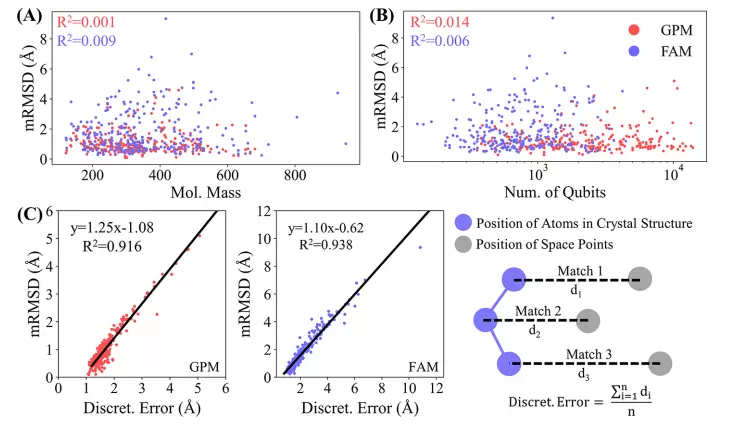 图4:mRMSD与分子质量(A)、量子比特数(B)和离散误差(C)之间的相关性,左上角表示相关性系数(R2)。右下角展示了离散误差定义,它表示所匹配的空间点和晶体结构中的配体坐标的空间距离平均值,GPM代表“网格点匹配”,FAM代表“原子特征匹配”。