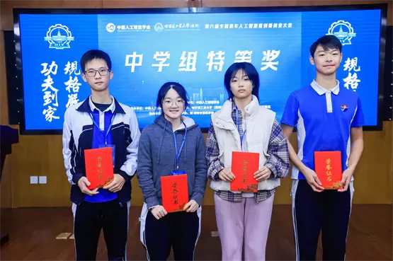 中学组比赛中,深圳市高级中学Golem团队作品《基于Yolo框架的智能公路巡检系统》,荣获中学特等奖。猎梦者 22715团队的《智能取物机器人》、新中二外代表队的《智能交通防撞系统》荣获一等奖。深圳市福田区梅林中学的《绘梦未来智慧城》、重庆南开中学的《失智老人智能护理辅助系统》荣获二等奖。