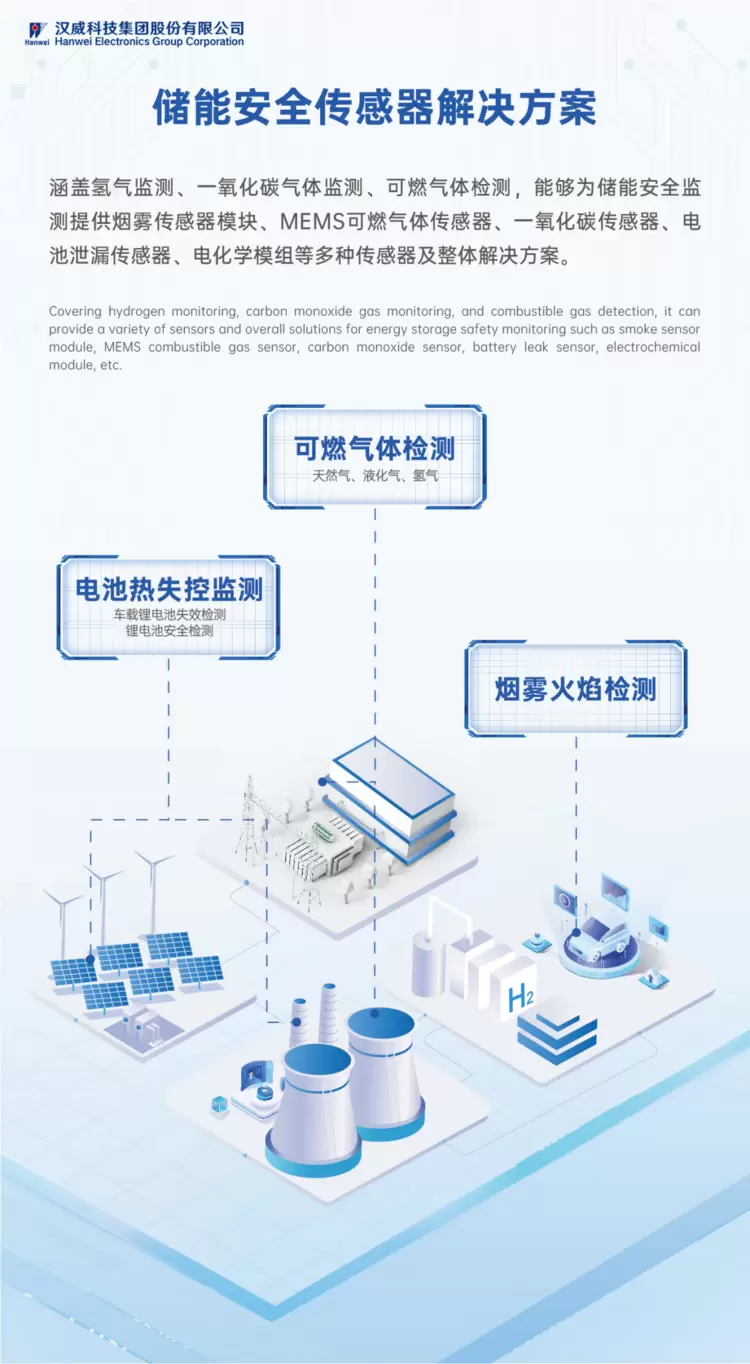 据悉,国内气体传感器龙头、智能仪器仪表及物联网解决方案提供商汉威科技集团,推出了储能安全传感器解决方案,可以通过一氧化碳、氢气、烟雾、VOC气体、气溶胶、温湿度等传感器,对储能系统进行空间点位检测、电池柜蔟级检测、电池包PACK级检测,为储能电站安全保驾护航。