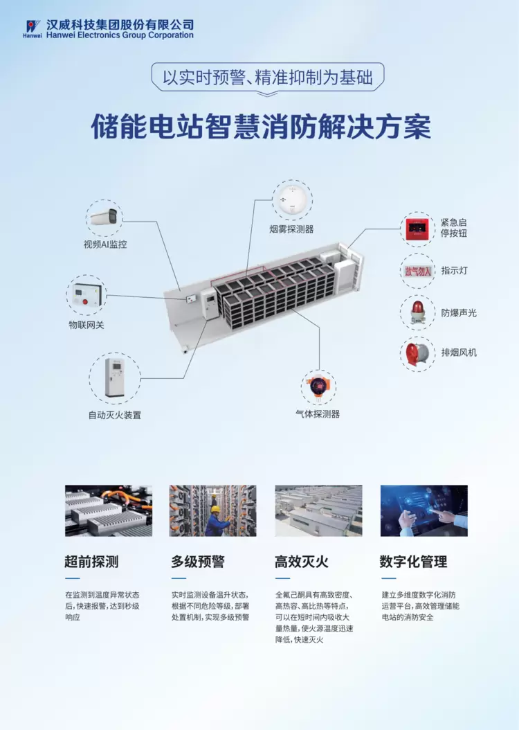 汉威科技集团还推出了储能电站智慧消防解决方案,可通过烟雾探测器、气体探测器、视频AI监控设备、自动灭火装置等智能硬件,实时监测设备升温状态、烟雾、气体等信息,并根据不同危险等级进行多级预警,一旦发生火灾,可联动排风风机、自动灭火装置,实现快速排烟灭火,全方位保护储能电站及工作人员的安全。