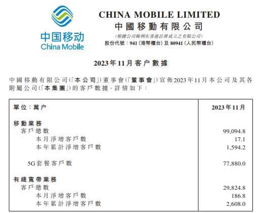 数据显示,2023年11月份,中国移动用户总数达到9.90948亿户,当月净增客户数17.1万户。有线宽带方面,中国移动有线宽带客户总数达到2.98248亿户,当月净增客户数186.8万户。