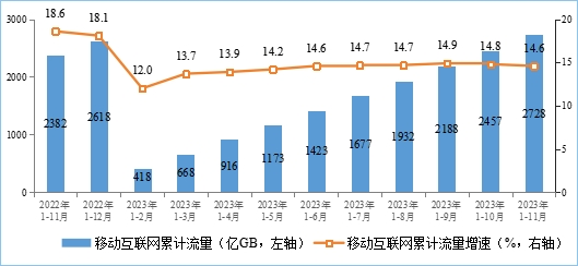 12月20日消息,据工信部数据显示,2023年1-11月份,我国移动互联网累计流量达2728亿GB,同比增长14.6%。截至2023年11月末,移动互联网用户数达15.1亿户,比上年末净增5611万户。11月当月户均移动互联网接入流量(DOU)创年内新高,达到17.99GB/户·月,同比增长8.5%,较上年12月份高1.81GB/户·月。