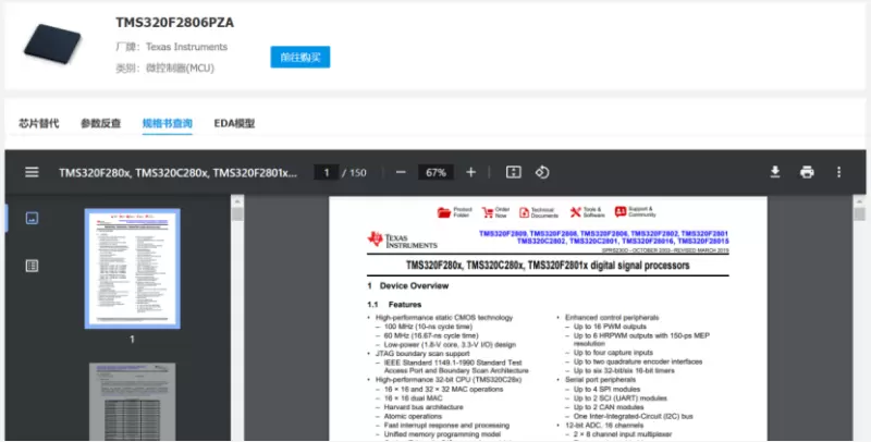 【芯片智选】元器件物料查询与选型工具快速捕捉当前平台23个大类,400多个小类元器件的参数变化以及库存状态,并将这一信息快速应用到替代料推荐中,从而大大提升了推荐的准确度和时效性。通过摆脱笨重的用户界面或复杂的程序查询,【芯片智选】实现了电子元器件替代料推荐过程的自动化,既节省了人力和时间资源,又达到甚至超越人工的准确度。产品规格书与EDA模型帮助客户获取更详细的产品信息,有效助力客户在元器件原始文件、选型、研发等方面提高运营效率。