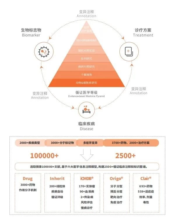 iCMDB知识库是基于循证医学等级的多维知识库,可以支撑并辅助进行精准医疗诊断、临床决策支持及人工智能应用。知识库包含了疾病、生物标记物、变异位点、药物、参考文献等基础元素,涵盖肿瘤、药物基因组学、单基因遗传病、线粒体疾病、传染性疾病、代谢类疾病、慢性病、风险预测等知识库。利用热点短阵等多种智能医学检索分析模型自动关联基础元素及各大知识库,在分子肿瘤学、药物基因组学、遗传学等领域为临床医生治疗决策提供更详实、更可信的循证医学方案。并通过了ISO13485医疗器械管理体系认证,获得了新加坡Class A注册生产许可证。