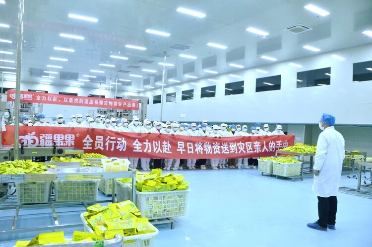 当天夜晚,喀什疆果果农业科技有限公司的生产车间也召开了动员会,大家全力以赴,必须以最快的速度将赈灾物资生产出来。