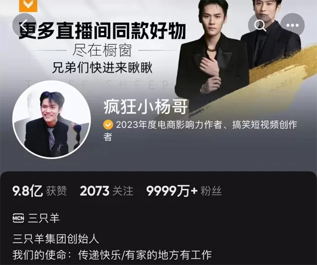 这家名为“三只羊”的MCN机构,其创始人正是坐拥抖音过亿粉丝的头部主播“疯狂小杨哥”。据公开资料显示,三只羊成立于2021年3月,目前已孵化出十余位千万级主播达人,累计合作品牌1000+,其当红直播间“疯狂小杨哥”自2022年开始便长期居于带货榜单前列。