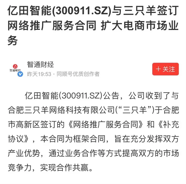 亿田公告称,公司已与国内头部电商企业「合肥三只羊网络科技有限公司」签订《网络推广服务合同》,旨在充分发挥双方产业优势,通过业务合作等方式提高双方的市场竞争力,实现合作共赢。