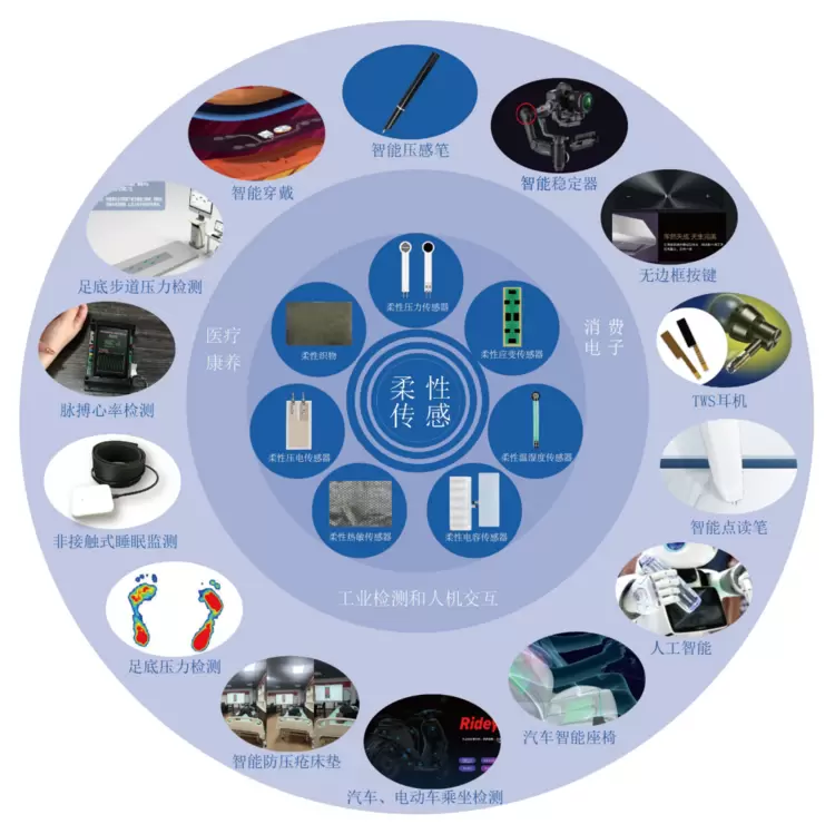 其现已掌握了柔性压阻、柔性压电、柔性温湿度、柔性电容、柔性汗液五大核心技术,拥有柔性压力传感器、柔性压电传感器、柔性织物、柔性应变传感器、柔性温湿度传感器、柔性热敏传感器、柔性电容传感器、柔性汗液传感器八大产品系列,百余项核心专利,还拥有一条年产千万支柔性传感器的超净印刷线和组装线,在消费电子、健康医疗、IOT等战略新兴产业均有相关应用落地,在柔性传感器产业化方面具有国际领先水平。