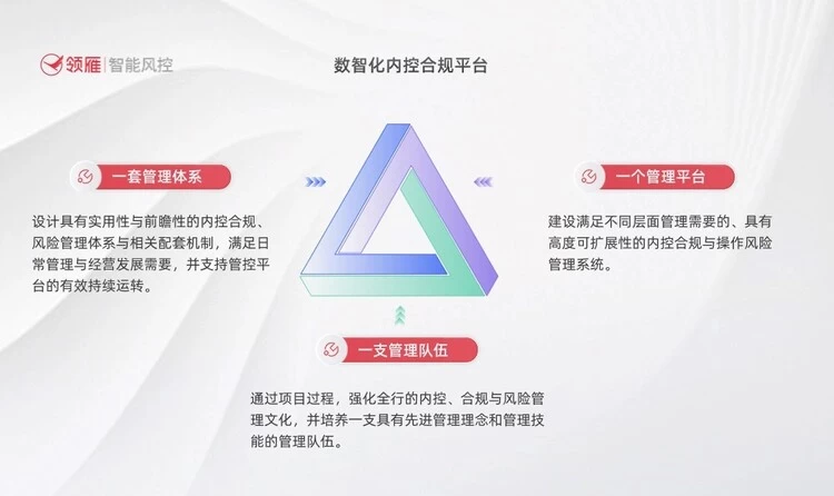 对于全面风险管理体系来说,一些在局部产生的风险问题,往往需要系统的整体调节及反馈才能解决或改善。因此,自上而下、充分借鉴同行经验的统一规划和设计,兼具持续发展的同时更针对性的解决短期内面临的问题和挑战,是领雁科技数智化内控合规平台建设的目标之一。