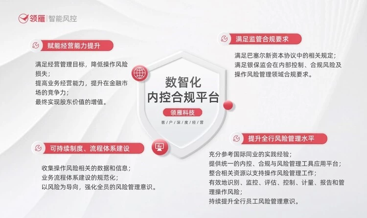 内控合规体系数智化转型是商业银行数字化转型战略的重要组成部分,领雁科技希望通过数智化内控合规平台的建设,不仅助力商业银行在方法论上获得更好解决方案及工具,同时在合规理念、管理模式、合规队伍方面进行同步提升,为银行打造出内控合规的“一体化管理平台、系统性管理体系、专业性管理队伍”,提高内控管理、操作风险、合规风险、案件防控的综合管控能力,助力实现客户深度经营业务战略和管理目标。