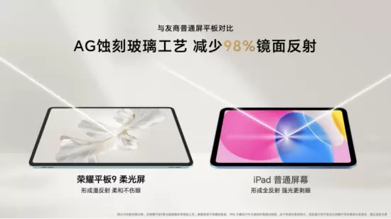 荣耀平板9搭载的纸感护眼柔光屏,屏幕表面通过荣耀自研的AG蚀刻玻璃工艺,产生微不可察的极小“起伏”形态,从而将强光源直射所产生的镜面反射转化为柔和的漫反射,达到能够消除98%的镜面反射光的效果,实现纸感护眼的读写体验。
