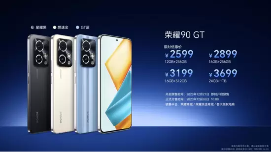此外,发布会上同台亮相的“性能灭霸”荣耀90 GT,凭借旗舰三芯、3D冰封冷驱散热系统和超凡帧画引擎,带给用户满帧不设限、PC级画质、超低延迟触控3项超凡游戏体验,制霸性能战场。此次荣耀90 GT共推出12GB+256GB、16GB+256GB、16GB +512GB、24GB+1TB四个版本,售价分别是2599元、2899元、3199元、3699元,12月21日即刻开启预售,12月26日10:08正式开售。即刻起,上荣耀商城,荣耀亲选商城,京东天猫抖音等各大授权电商平台,全款预订,即享至高100元优惠及6期免息。
