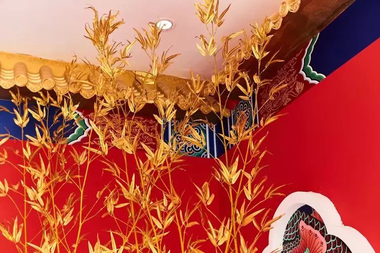 体验点内,背景以红墙黄瓦为主,墙上布着数个中式洞窗,各有不同纹饰,间或有金黄色的修竹点缀其间,居中整幅白扇形屏风,入口处也布置成了月洞门,各处细节精巧细致,古意盎然,彰显着国风之美。