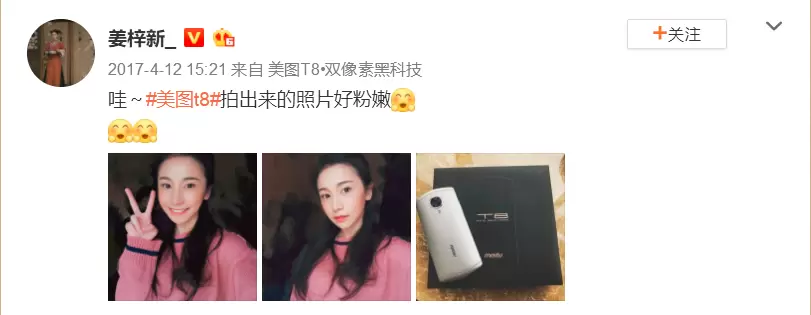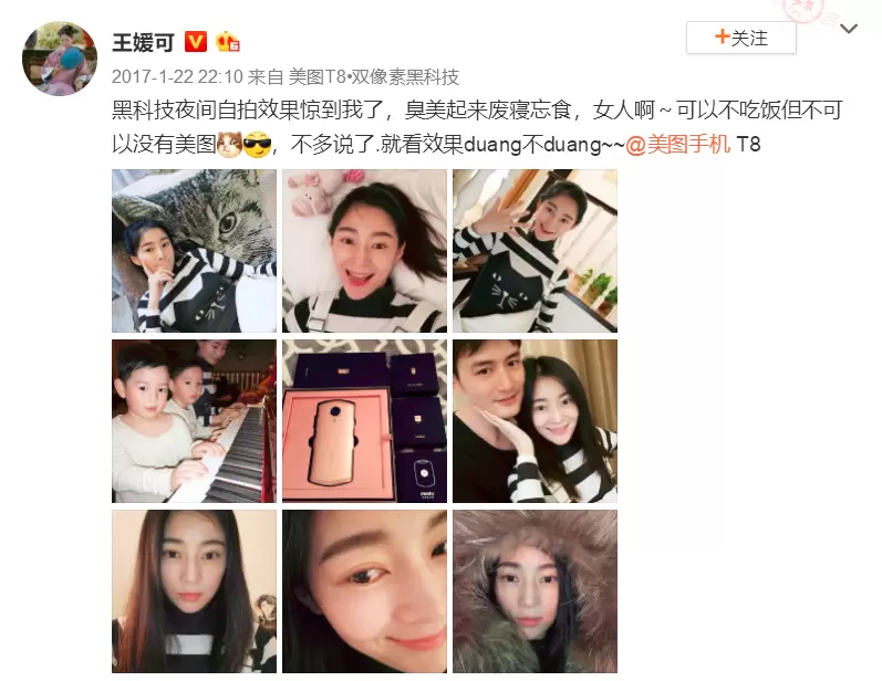 不过,这可不是“纯妃”的美图手机初体验,早在美图T8发布时就已是“忠粉”,并发微博称赞美图手机让自己“臭美起来废寝忘食,女人啊~”难怪这次能这么迅速就get美图T9的黑科技哦。