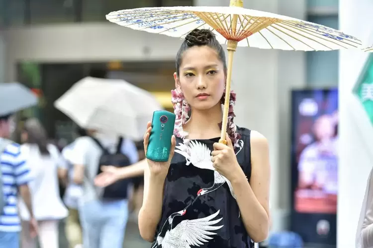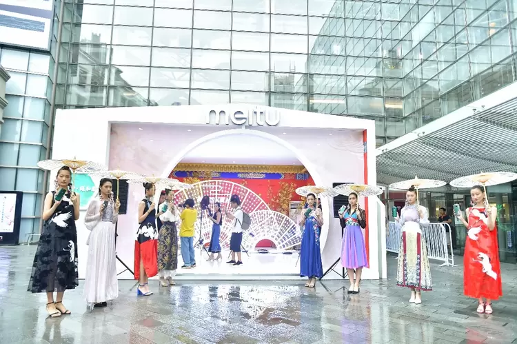 活动当天,现场还上演了一场精彩的旗装快闪秀,身着点缀古典元素改良旗装的模特们,手持刻有“江崖海水”纹路的美图T9颐和园限量版,举着油纸伞穿梭于广场,淅沥沥的小雨中仿佛穿越回了古风盎然的过去,也引来了不少人的驻足围观和拍照。