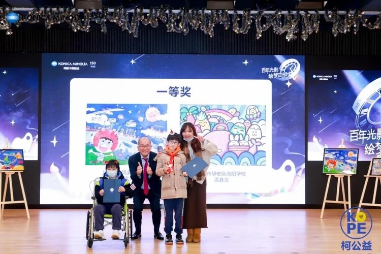 嘉宾发言之后,主办方公布了本届大赛的获奖名单,其中上海董李凤美康健学校费家齐创作的《300岁生日快乐!》、静安南阳学校孟鑫含创作的《我们都是地球一家人》荣获一等奖。中田裕司董事长代表柯尼卡美能达向获得一等奖的同学颁发了奖状及奖品,并向5所特殊学校捐赠了爱心教学物资。