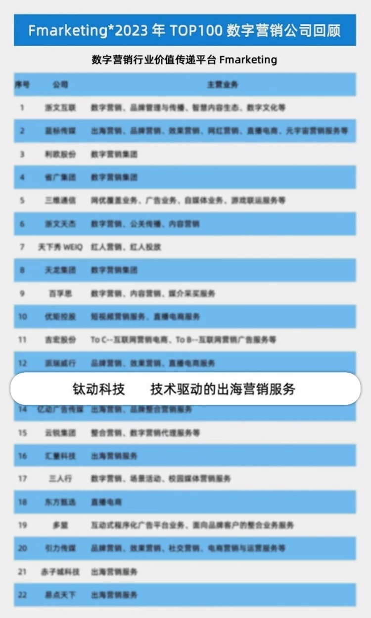 近日,国内知名的数字营销行业媒体Fmarketing正式发布《2023年TOP100数字营销公司回顾报告》。凭借出色的营销服务和专业的技术能力,钛动科技再度强势入选,以优异的市场表现获得行业媒体的认可。