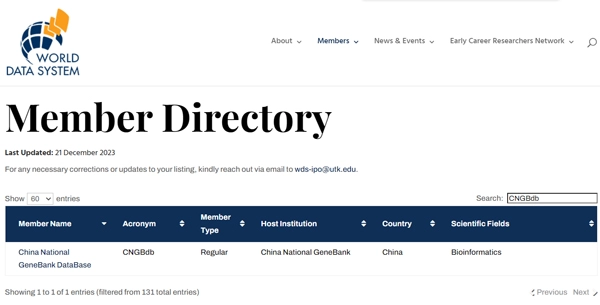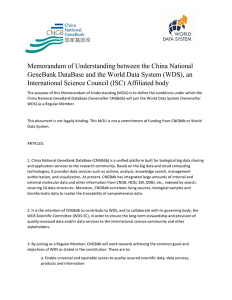 12月21日,国家基因库生命大数据平台(CNGBdb)与世界数据系统(WDS)签署谅解备忘录(MOU),成为截至目前WDS在生物信息领域的首个正式会员(Regular Member)。
