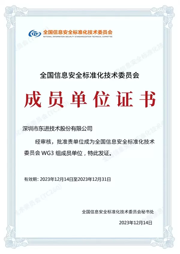 近日,东进技术获批加入全国信息安全标准化技术委员会(简称“信安标委”),成为信安标委密码技术标准工作组(WG3)成员单位。