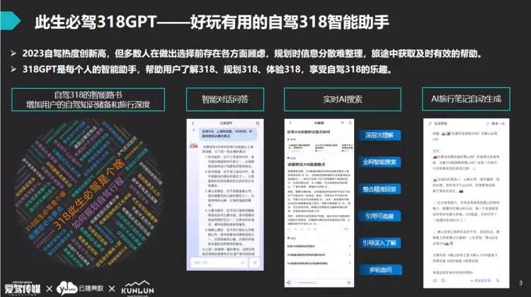此生必驾318 IP是中国公路文化发展传播的重要载体,云捷亮数与此生必驾长期合作,懂318、懂数据、懂用户;此次发布的「公路旅行SkyAgents」则是昆仑万维在大模型领域的最新尝试,云捷亮数将与昆仑万维一道,为公路旅行者和驾驶者带来更好的出行体验,提供便捷、安全、高效、创意的服务。「公路旅行SkyAgents」将进一步拓展大模型技术的应用范围,展示了大模型技术在场景落地中的实用性,为中国大模型产业探索更为广阔的发展空间。