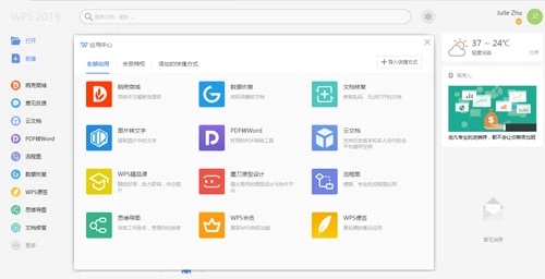 WPS Office 2019左侧栏集合了稻壳商城、云文档、PDF转Word、数据恢复、WPS便签等,需要的功能一目了然,一触即达。