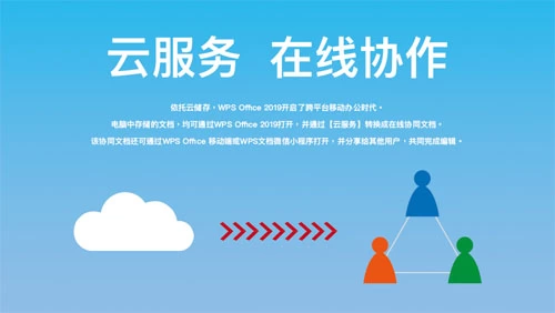 依托云储存,WPS Office 2019开启了跨平台移动办公时代。电脑中存储的文档,均可通过WPS Office 2019打开,并通过【云服务】转换成在线协同文档。该协同文档还可通过WPS Office 移动端或WPS文档微信小程序打开,并分享给其他用户,共同完成编辑。