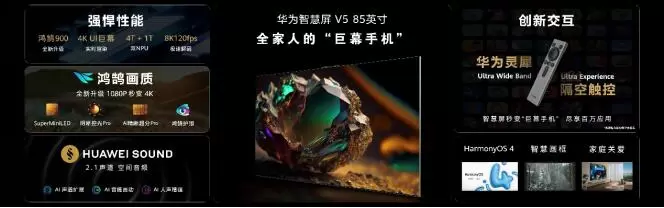 2023年12月26日,华为智慧屏 V5正式发布。作为华为智慧屏旗舰系列的新成员,华为智慧屏 V5延续了华为智慧屏 V系列外观、性能及智慧交互体验上的高水准。智慧功能上,持续搭载华为灵犀隔空触控,让操控智慧屏像玩手机一样轻松便捷,配合丰富的移动应用生态,解锁“巨幕手机”的百种新玩法。在画质上,其SuperMiniLED鸿鹄画质,为用户构筑更清晰沉浸的画质体验。娱乐上,依托多项核心技术底座打造高端、沉浸的85英寸巨幕影院,以创新的人机交互方式搭配HarmonyOS 4的丰富智慧场景,解锁诸多百种新玩法。