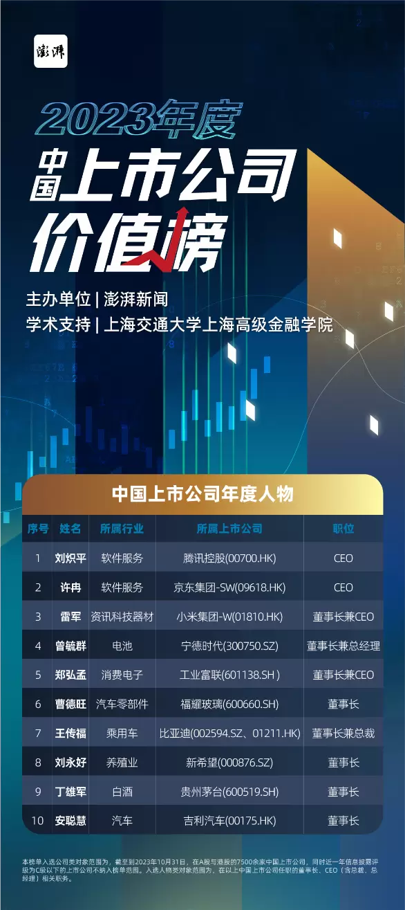 据悉,该榜单由澎湃新闻发起,由上海交通大学上海高级金融学院学术支持,坚持公平、公正、公开的原则,依据中国上市公司的市值、盈利能力、股东回报率、发展稳健性、企业声誉、行业地位、创新力、ESG等指标的总体表现,筛选出财务绩效优异、治理水平较高、拥有优秀管理团队及在品牌、战略、ESG等指标上表现突出的中国上市公司,并表彰杰出的中国上市公司年度人物。