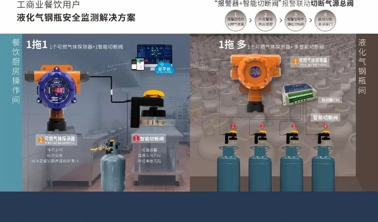 汉威工商业餐饮用户液化气钢瓶安全监测解决方案,采用工商业专用可燃气体探测器,抗干扰能力更强,对餐饮厨房操作间、液化气钢瓶存储间均可进行泄漏报警;还可根据餐饮店实际情况,灵活配置“1拖1”(1个工商业可燃气体探测器+1个智能切断阀)、“1拖多”方案,以满足餐饮店多元化用户安全需求。