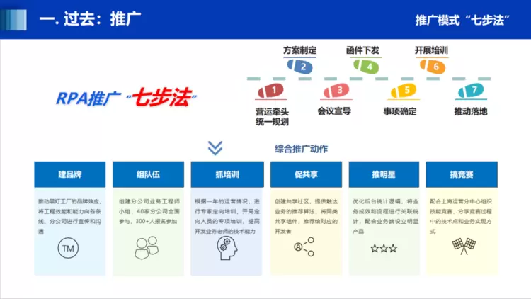 他指出,通过“1+3+N”的运营模式,以及“七步法”的推广模式,即总厂、三分厂和N家分支机构的结合,通过从上而下和从下而上的协同推动,促进了RPA在公司中的大规模应用。黑灯工厂1.0在成立的两年中取得了显著成效,成功实现了对RPA机器人集中部署、集中运行的集约化管理,充分发挥“流程自动化”在公司数字化转型中的驱动力,推动了生产方式和管理方式的变革。在业务赋能、营运效率、流程标准、辅助决策、合规风险、太保服务等六方面促进数字技术与公司发展深度融合。
