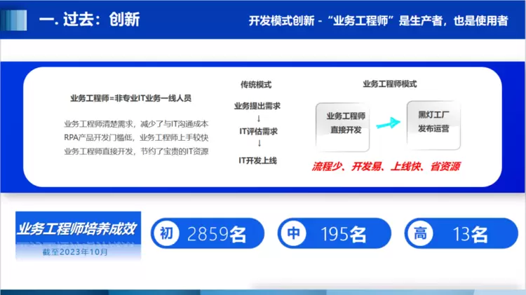 “业务工程师”指的是非专业IT业务一线人员,他们既是开发者,也是使用者,通过联合艺赛旗的专业RPA培训,业务工程师可以直接进行开发。通过该模式有效减少与IT沟通成本,节约了宝贵的IT资源,至今,太保已经培养了超过3000名业务工程师。