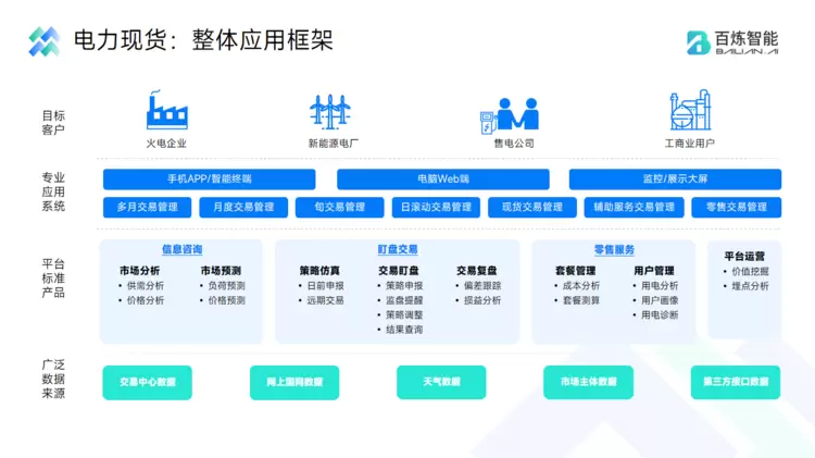 为了帮助发售电企业加速电力交易转型,百炼智能基于先进的AI及数据分析技术、系统开发能力,自主研发“百炼智电”产品,为发售电企业建设一站式电力现货市场交易及决策平台,强化企业管控水平、决策能力以及用户服务能力,实现电力交易收益最大化。