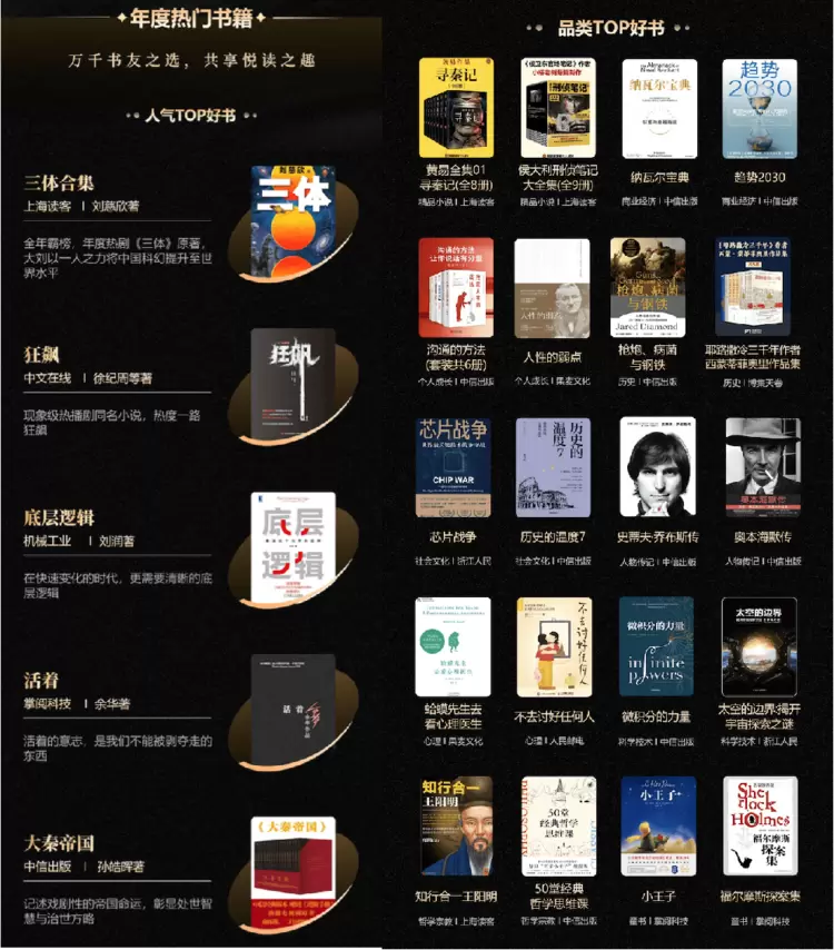 从现象级科幻小说到年度人物传记,从久远的历史追溯到奇妙的未来幻想,华为阅读2023年度热门书籍榜单选取了2023年读者们最喜欢的5本人气TOP书籍和不同品类的TOP书籍。今年,在内容生态上惊喜不断的华为阅读,先后签约了数十家内容合作伙伴,拥有40多品类百万精品内容库、180万+有声内容,汇集《琅琊榜》《盗墓笔记》《庆余年》等优质爆款IP,轻松满足读者的一站式阅读需求。备受读者喜爱的《三体合集》《狂飙》《底层逻辑》等热门书籍都能在华为阅读端内即时找到。