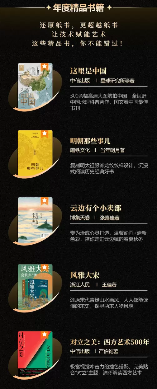 你是否曾想过,书籍也如艺术品般独特而有内涵?专属书封、微动效、精装排版……华为阅读精品书以科技赋能,巧妙平衡了设计之美与体验之美,纸质书的单一静态内容变为栩栩如生、跃然纸上的艺术作品。而个性化的情感音色朗读,也为阅读增添了几分乐趣。此外,透过2023年度精品书榜单,你会发现,历史耐读普及读物《明朝那些事儿》、治愈小说《云边有个小卖部》、社科好书《这里是中国》纷纷上榜,覆盖不同品类。让我们一起揭开这份饱含真心的精品书榜单,共同感受科技带来的阅读新体验。