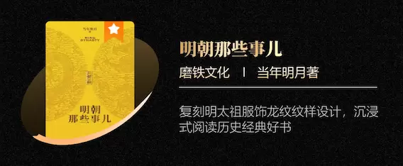 《明朝那些事儿》在内容上以网络语言将明朝历史娓娓道来,在作者诙谐幽默的笔法中俯瞰三百年明朝历史。华为精品书《明朝那些事儿》复刻了明太祖服饰龙纹纹样设计,带读者沉浸式穿越明朝,在字里行间行走于古代宫阙之中。“以史为鉴,可以知兴替。”明朝历史的每一个片段都有精彩的故事,都彰显着中国人的文化密码、政治逻辑和人生经验。
