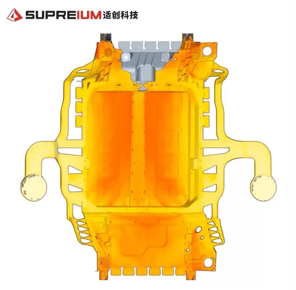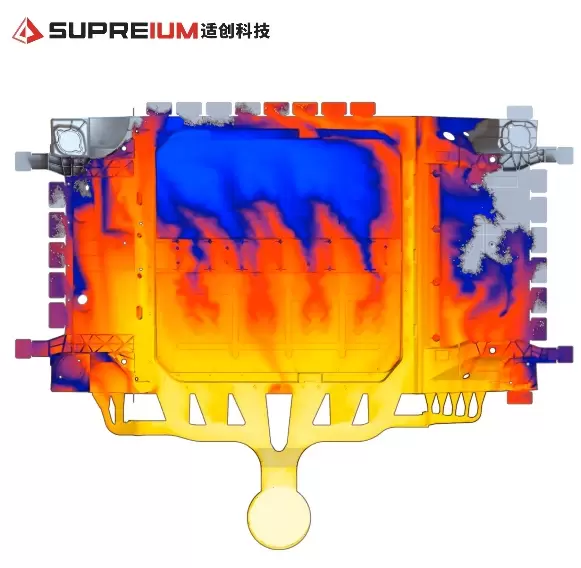 全球首款双料筒压射仿真为图中所示的一体压铸下车身平台,长达2.4米,在模拟仿真中达到了4亿网格量这一超大规模,采用SupreCAST智铸超云144核计算资源,仅用44小时即完成模拟计算。