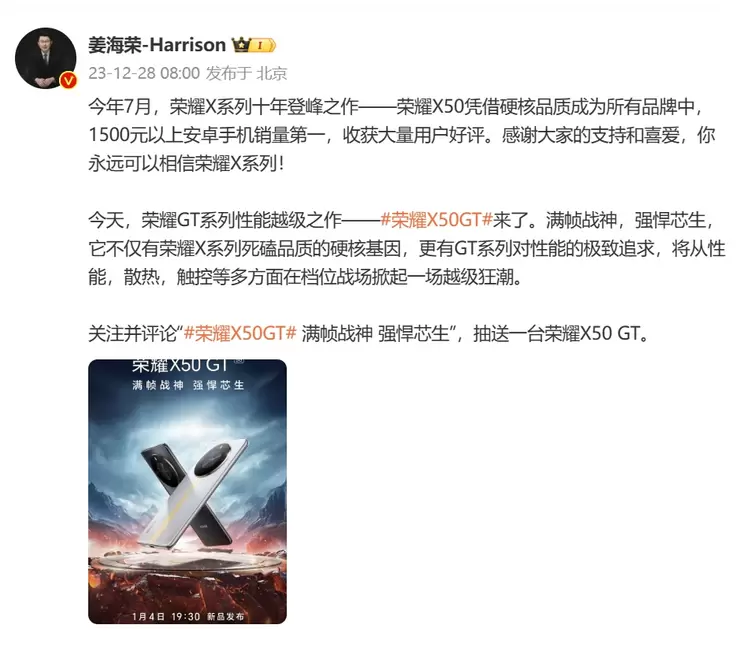 荣耀GT系列再添新悍将:满帧战神荣耀X50 GT官宣1月4日发布