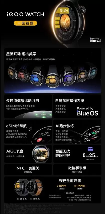 2023年12月28日,iQOO旗下首款智能手表—iQOO WATCH正式开售,搭载自研蓝河操作系统,具备多通道健康运动监测和长久续航能力,支持eSIM独立通信功能,首销期优惠价仅需1049元起,搭配Neo9系列购买更是低至999元起。