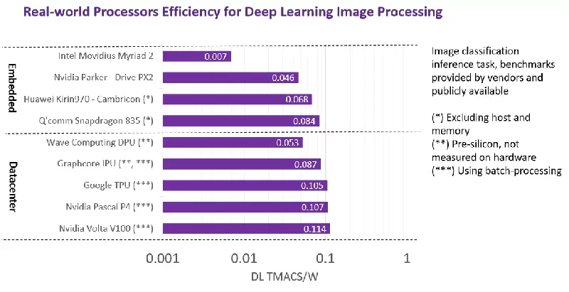 实现更高每瓦性能的竞赛深度学习性能效率是AI处理器竞争对手之间经常引爆的一场大辩论。在英伟达(Nvidia)和英特尔/Mobileye之间,两家竞争对手的高层还公开争辩其于Xavier SoC和EyeQ5的主张。