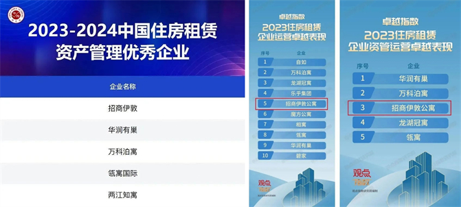 在充满收获的2023,招商伊敦及旗下各项目也分别在资产管理、品牌影响力、品牌运营、品质服务等多方面收获诸多肯定,累计获得奖项超过90+,招商伊敦公寓业务多次跻身行业前五,再创新的辉煌。