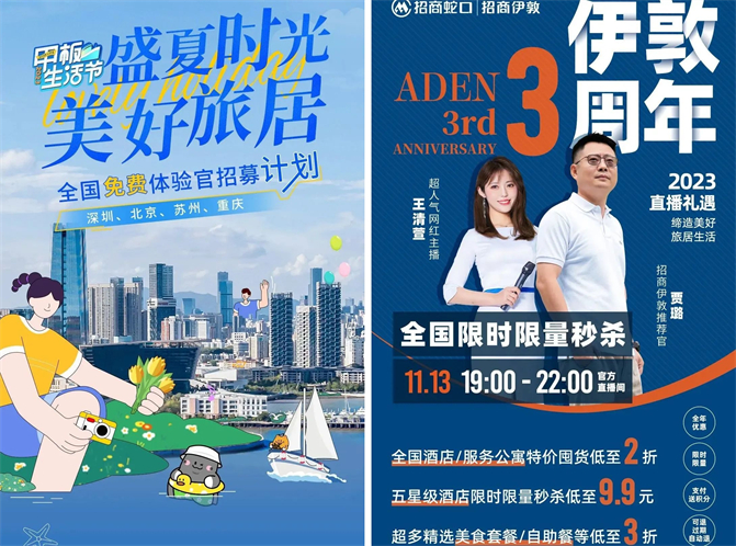 2023年招商伊敦通过直播、周年庆、国庆和微信商城特惠等大型活动,陪伴粉丝度过春夏秋冬每个节庆,持续推出美食、酒店、长租公寓相关产品的优惠福利,用优惠便利的套餐、宠粉的秒杀产品以及0元住等钜惠活动,带给用户实实在在的省钱省心。