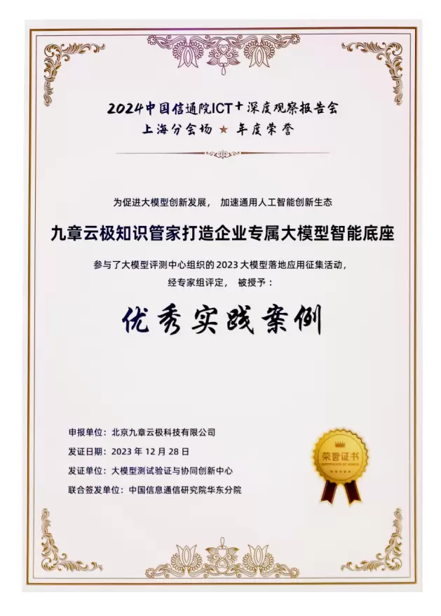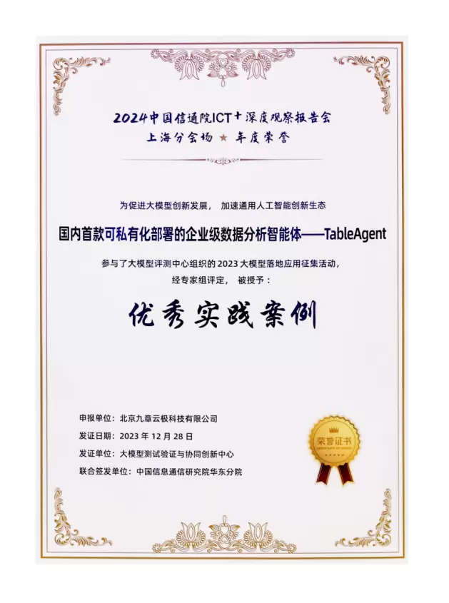 12月28日,2024中国信通院ICT+深度观察报告会之大模型驱动数字经济新生态峰会圆满举办,中国信通院在会上重磅发布《2023大模型落地应用案例集》(以下简称“《案例集》”),凭借丰富的大模型落地经验和极具商业价值的应用前景,九章云极DataCanvas公司的两项大模型落地应用标杆案例——TableAgent数据分析智能体、企业知识管家,成功入选《案例集》并获得通用大模型落地优秀实践案例!