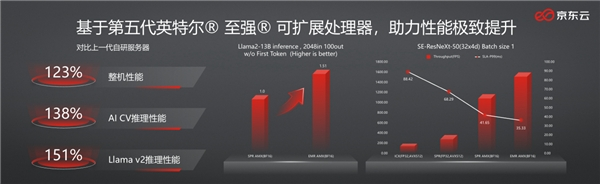 京东大模型第一次亮相就收获完美成绩,很大程度上要归功于其部署的基于第五代英特尔® 至强® 可扩展处理器的新一代自研服务器,与上一代自研服务器相比整机性能提升23%,关键的AI CV推理性能与 Llama v2大模型推理性能更是分别提升38%与51%。
