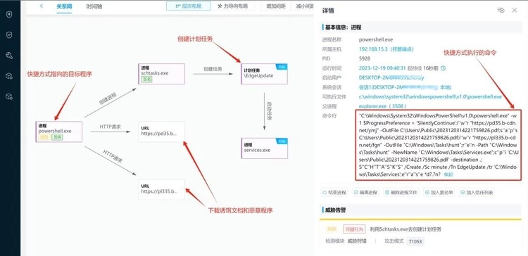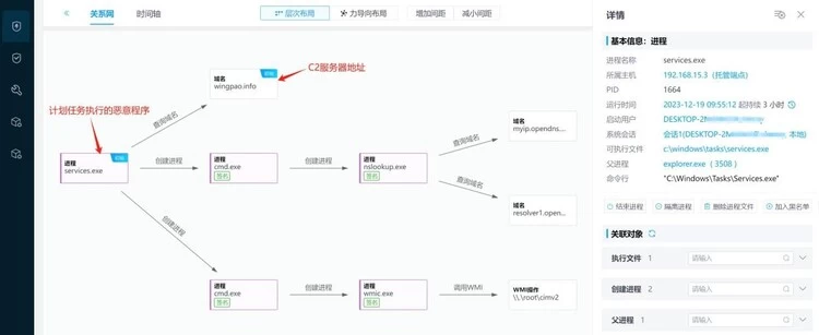 瑞星EDR已将此次攻击的全部过程进行可视化还原,帮助用户看清攻击者的每一步操作,并结合RGPT人工智能技术对攻击流程进行精准分析,定位、查看、了解攻击的方向以及恶意代码活动的关键链条。