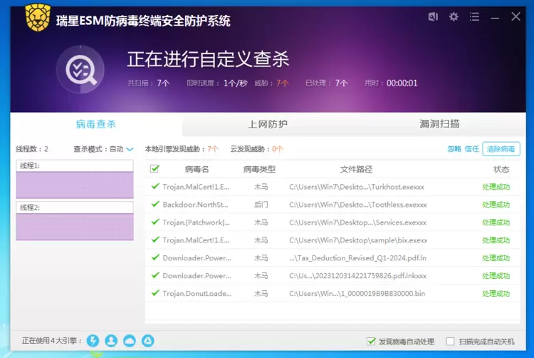 图:瑞星ESM防病毒安全软件查杀相关病毒