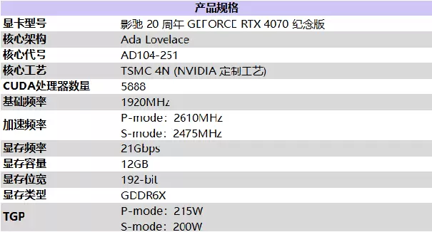 影驰 20 周年 GeForce RTX 4070 纪念版 采用GeForce RTX 40系列全新一代NVIDIA Ada Lovelace 架构核心,核心处理器型号为AD104-251。作为ADA架构的旗舰型号,能为玩家提供顶级性能,可让游戏玩家和创作者在性能、AI 驱动图形领域以及其他领先的平台功能上实现质的飞跃,其提供的体验穿越速度,不止于快。换句话说,该卡游戏性能相比 GeForce RTX 3070Ti 提升 20%,其独有的NVIDIA DLSS 3 技术下提升 70%。该架构配备了第三代 RT Core 和第四代 Tensor Core,以及支持NVIDIA DLSS 3.5技术,其中包含超分辨率、DLAA、帧生成、光线重建等技术,让玩家们在游戏时能够完美的感受技术与性能的震撼,感受精美的画面的同时拥有高帧流畅体验。影驰 20 周年 GeForce RTX 4070 纪念版基础频率为1920MHz,而在影驰 20 周年 GeForce RTX 4070 纪念版 所配备的DUAL BIOS 一键切换功能下,能轻松实现P-mode & S-mode双应用场景。在S-Mode 标准模式下频率达到2475MHz,在P-Mode 性能模式下则是高达2610MHz,一键超频带来更强的性能!