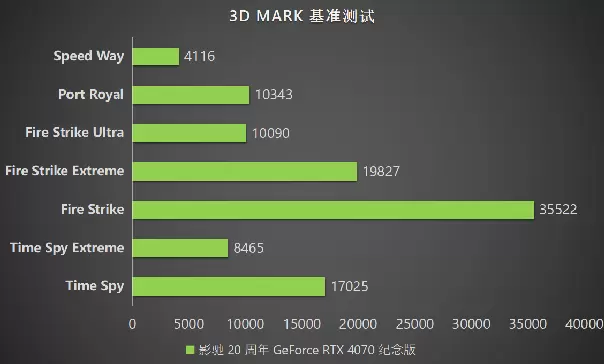 通过数据可以得到,在3DMark TimeSpy DX12测,影驰 20 周年 GeForce RTX 4070 纪念版 的显卡分数达到了17025分。在3DMark Fire Strike DX11测试中,影驰 20 周年 GeForce RTX 4070 纪念版 的显卡分数为35522分。其性能能让玩家流畅运行市面上的大多数游戏,实现高刷新率的需求。而在3DMark Portal Royal光追测试中,影驰 20 周年 GeForce RTX 4070 纪念版的分数达到了10343的高分。即意味着该卡在进行3A光追游戏大作时的性能体现。