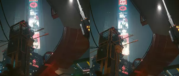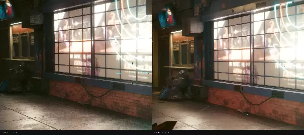 通过对比图玩家可以看到,启用NVIDIA DLSS 3.5后,在保证画面不流失的情况下,让玩家的帧数得到上涨。在对比图中,可以明显看出在霓虹灯的映衬下,光线重建对于铁丝网的渲染也更加准确,比没有光线重建特效下的画面更加清晰。