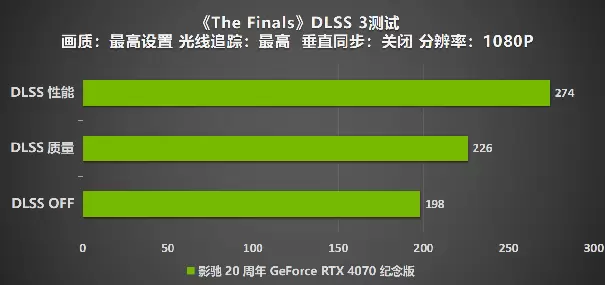 相比起《赛博朋克2077:往日之影》,射击类游戏对于硬件的要求就显得格外的轻松了。在《THE FINALS》中,影驰 20周年 GeForce RTX 4070 纪念版 在1080P分辨率下可以轻松跑到近100帧的成绩。开启NVIDIA DLSS 3 后,在质量模式下可以达到226帧,在性能模式下帧数更是上涨了76帧之高。
